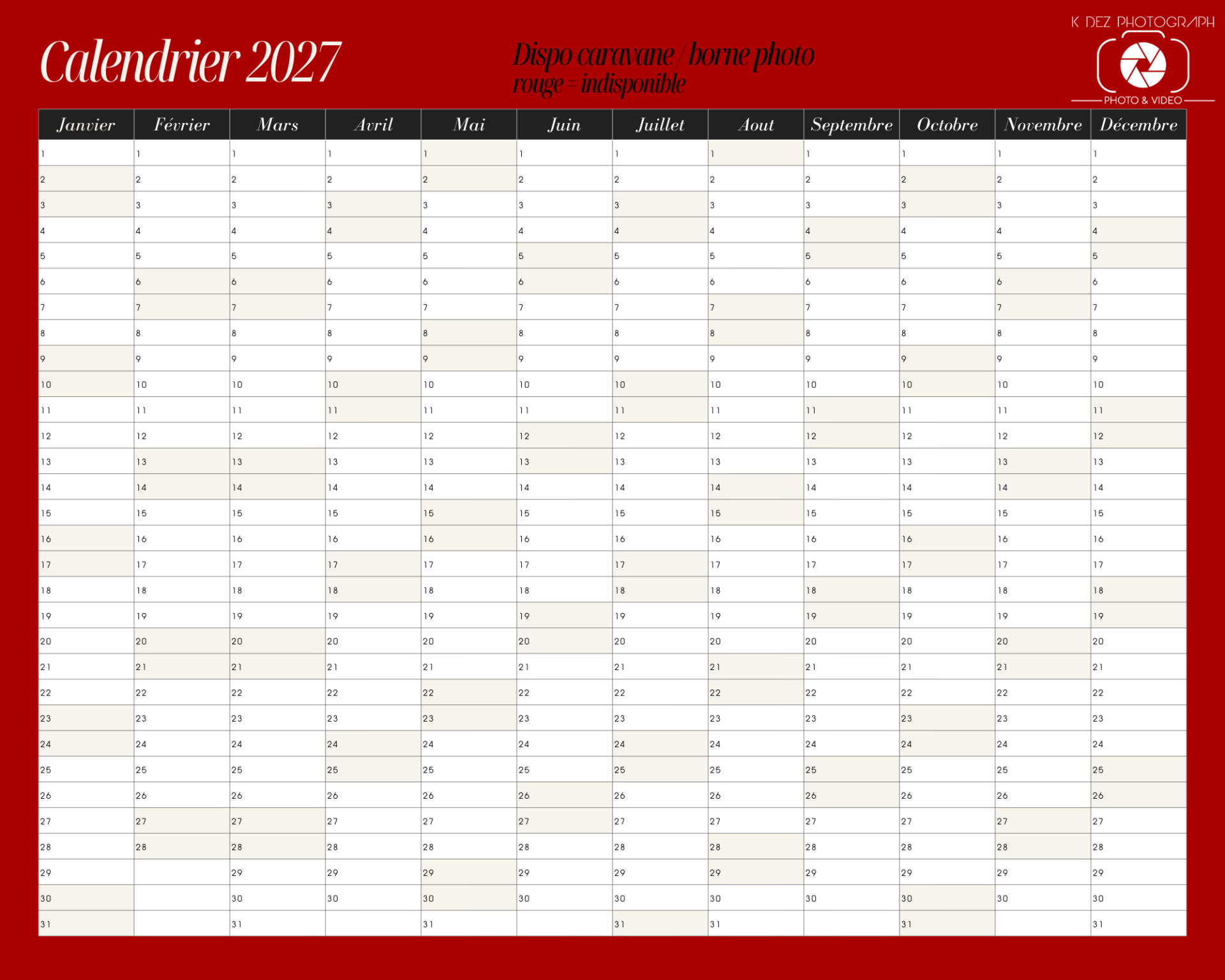 Vous souhaitez connaitre les disponibilités concernant la caravane K'pture et la borne photo, et bien il vous suffit de cliquer sur les photos ci-dessous (année 2026 à gauche et 2027 à droite).